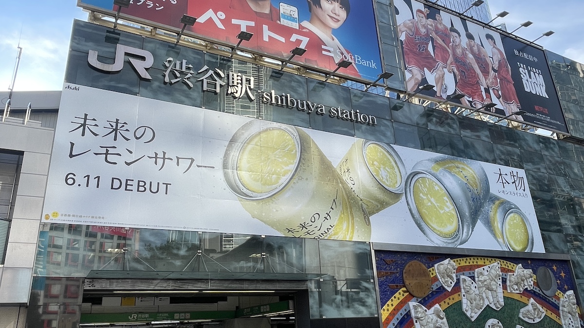 アサヒビールが渋谷で展開した「未来のレモンサワー」の広告は、未来的な商品コンセプトに合わせて非常にシンプルでインパクトのあるデザインが採用されました。渋谷エリアの大型広告として展開され、デジタル要素を組み込んだ未来的なイメージが話題を呼びました。